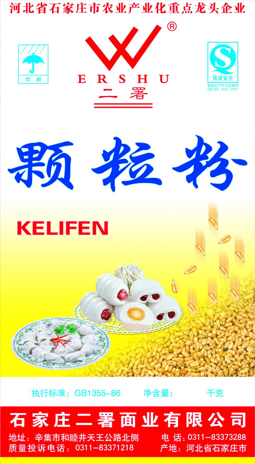 河北面業         二署面業有限公司創建于1989年,現已具備日處理小麥300噸的能量,產品質量穩定,深受客戶青睞。 二署面業地理位置優越,北靠307國道石黃高速,南鄰石德鐵路,衡井國道,交通十分方便,為貨物運輸提供保證及時運輸的天然條件。產品運銷:黑龍江、吉林、遼寧、河北、內蒙、陜西、山西等大中省份,贏得了廣大消費者的認可。 河北面業